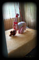 Bound in my favorite red rope, arms straight up into the air, balanced precariously on her knees, and then I start to play with her - how much more can she endure? |