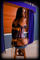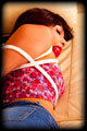 My two previous shoots with Samantha had her fully clothed, but I was hoping to see some more for this one. When I suggested a lingerie underwear shoot this is what she presented me with - sexy G-String and matching bra. A nice box tie kept her arms nice and high as to not spoil the amazing view, and the use of a crotch rope made things even more interesting. With her legs bound together tightly and pulled up into a hogtie by her breast ropes, her sexy and curvy bottom was very nicely presented indeed. |