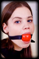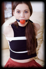 Samantha comes to give some bondage work a go with ARW. I immediately find that this cute young girl has the most amazing flexible arms! Her elbows are just begging to always be bound together. Not only do they touch, they are bound about as hard together as could possibly be! I bound those arms of hers together at her wrists as well as above and below her elbows, then bound her to the chair with her legs pulled up and wide apart. To finish off, I stuffed a 2" ball gag into her mouth. |