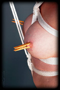 Courtney is forced to maintain are rather tricky position indeed. She is bound with her legs folded up and tied to the back of her thighs while balanced on top of a rather rickety foot stool. Her arms are bound tightly behind her back with her elbow together, and so the only things keeping her from falling are the ropes attached to the rope harness around her body. Problem is, that rope harness has a rather tight fitting crotch rope part of it! Just to make things even more interesting for her, out come the Clothes Pegs...... |