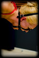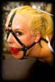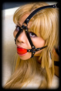 There are two positions I love - hogties and strappadoes - and Ariel does the latter oh so well!! She is forced forward, with her arms bound at her elbows and touching, and straight up to the roof, her ass sticking out for whatever my crop decides to do with it, and the nasty large ring gag harness strapped in. |